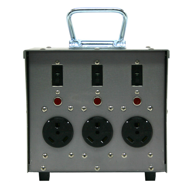 100 amp lunch box with 2x 3-prong 120 volt RV plugs, plus 2x 20 amp edision duplex outlets.