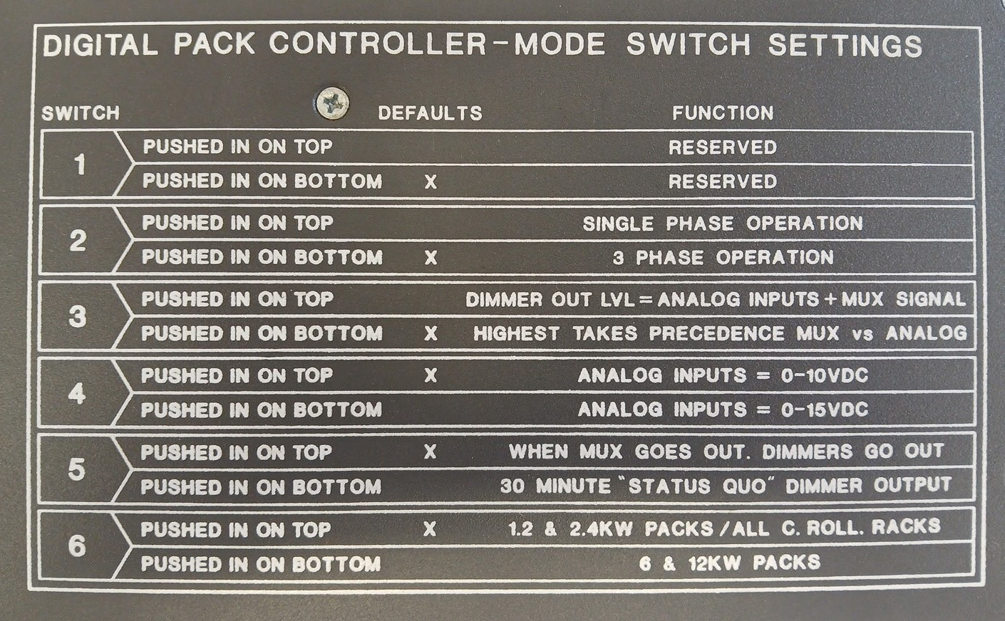 The optional Controller has dip switches to select the rack Mode, and one primary, fully magnetic circuit breaker for each dimmer, mounted to the front panel that provides protection for individual dimmers.