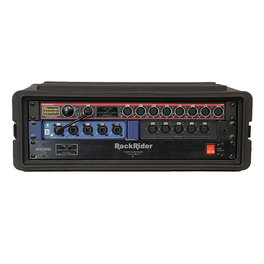 A prebuilt 3U rack-mount data and DMX distribution system designed for professional motion picture lighting setups. This unit centralizes Ethernet, PoE, and DMX routing in a single deployable rack.